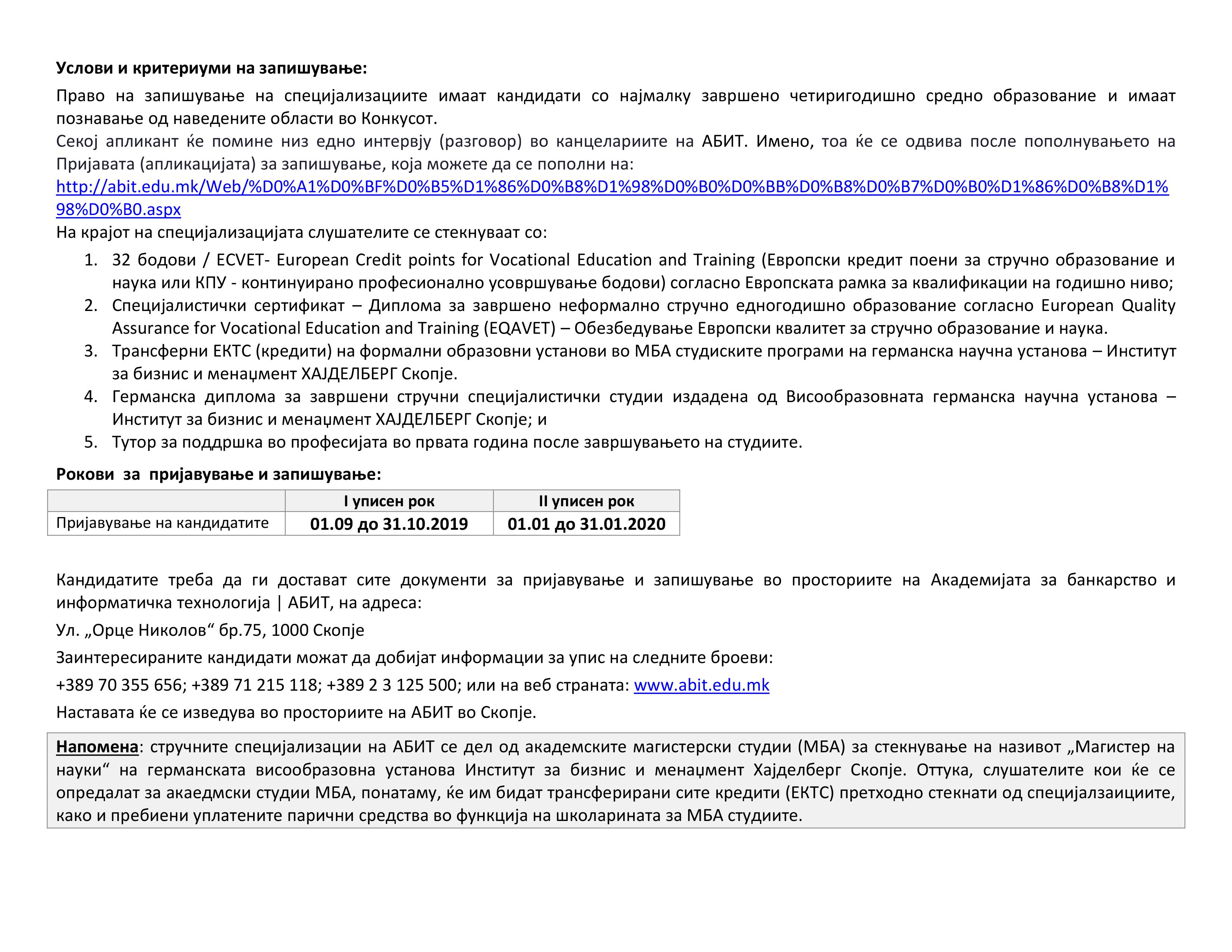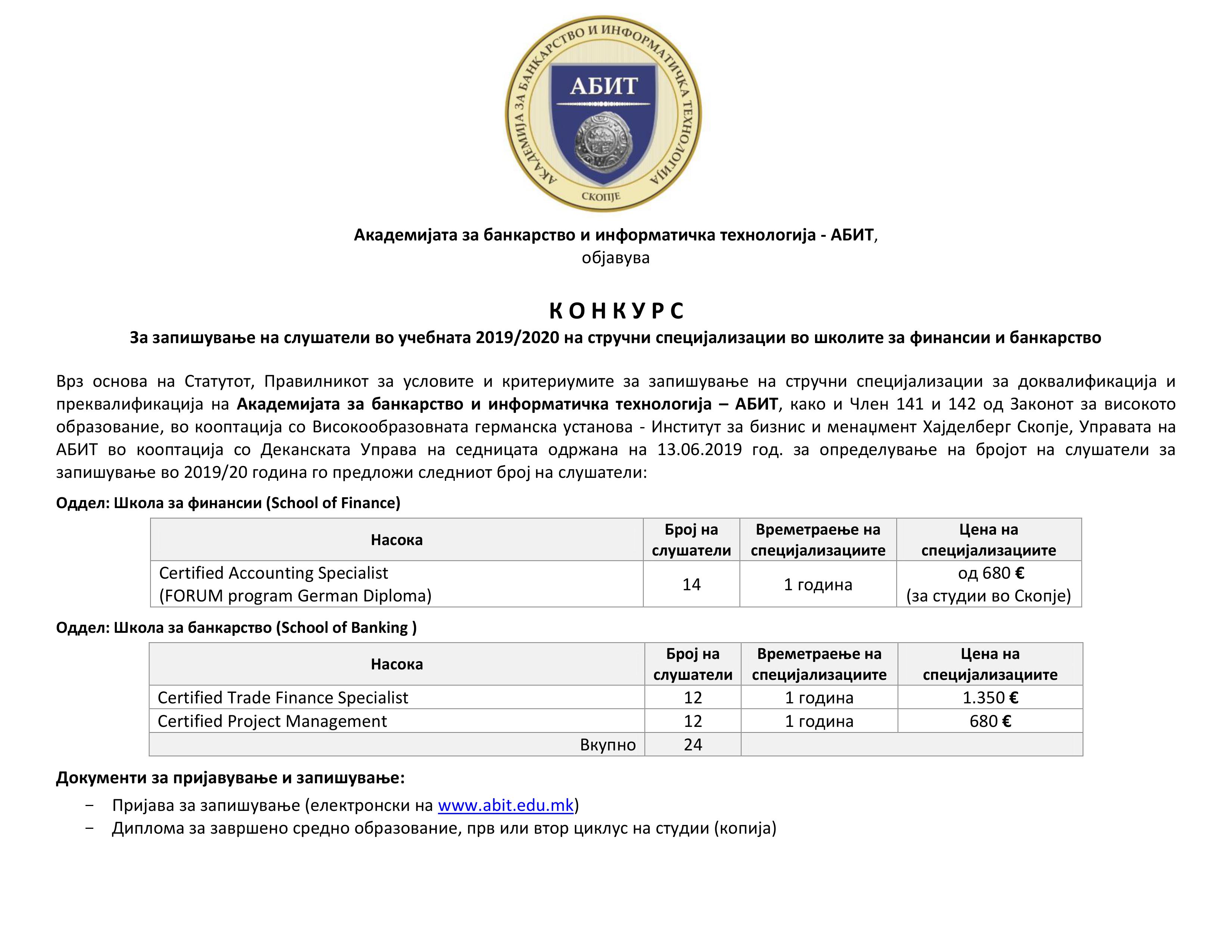 Конкурс за запишување на слушатели на стручните специјализации на АБИТ за 2019/2020